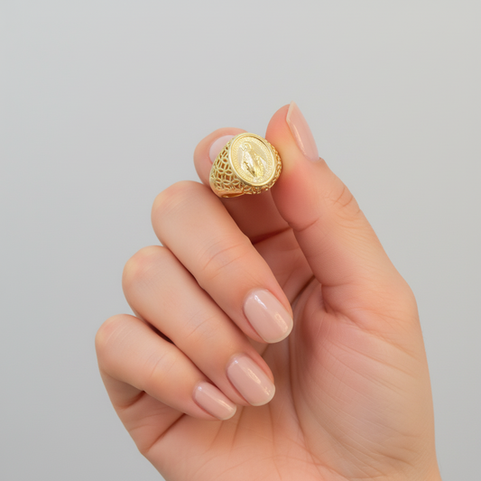 WO80 Anillo Tipo Chevalier Virgen de los Rayos Esfera Ovalada 14 x 11 mm ancho argolla 3 mm Anillo Baño Oro