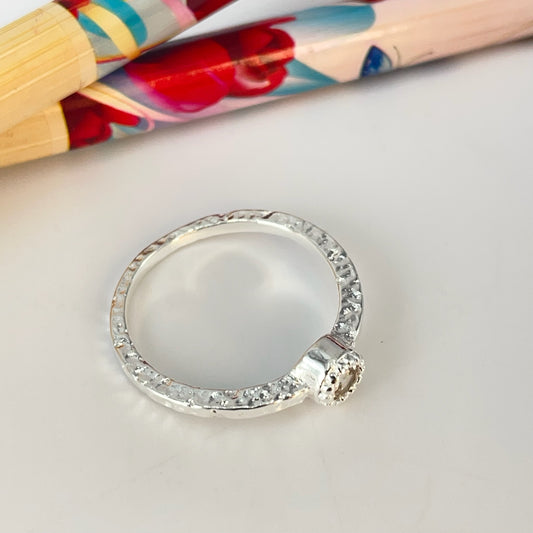 WP76-12 Anillo Martelado Circón Borde Rutilado 5 mm Ancho argolla 1.2 mm Espesor 1.2 mm Anillo Baño Plata