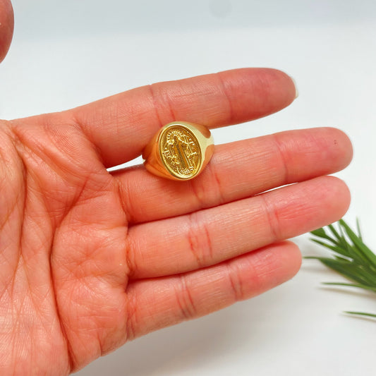 WO80 Anillo Tipo Chevalier Virgen de los Rayos Esfera Ovalada 14 x 11 mm ancho argolla 3 mm Anillo Baño Oro