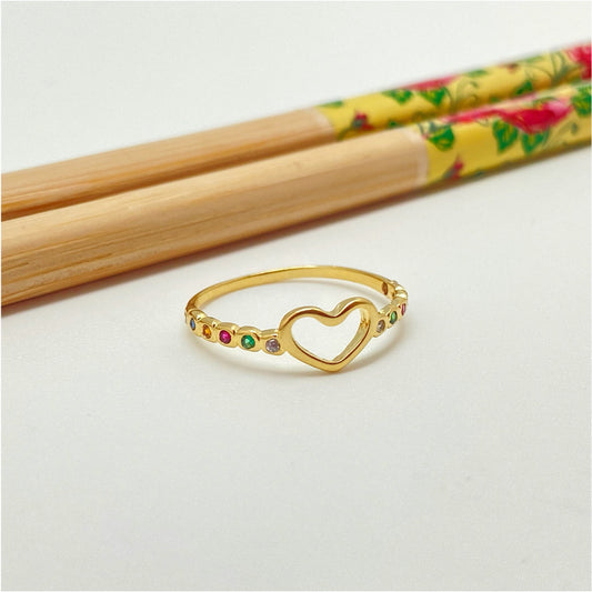 WO50 Anillo con corazón calado 6x9 mm y 12 circones multicolor laterales Ancho argolla 2 mm Anillo Baño Oro