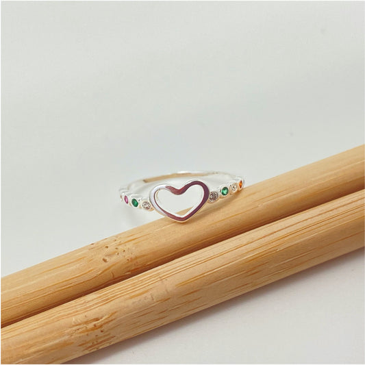 WP50 Anillo con corazón calado 6x9 mm y 12 circones multicolor laterales Ancho argolla 2 mm Anillo Baño Plata