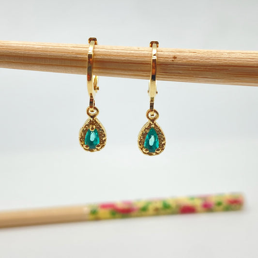 XO235 Aro Argollita con Gota Circón Verde Turmalina Borde craquelado Argolla 12 mm Gota 8x6 mm Aro Baño Oro