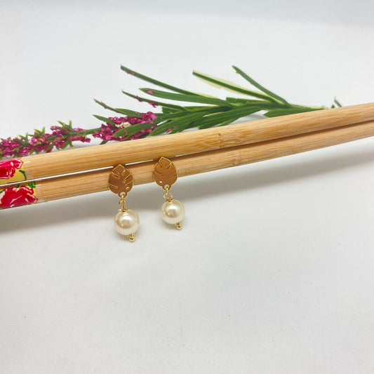 XO438 Aro Mini Monstera Perla Base Hoja Monstera 12x8 mm Perla Diá. 8 mm Largo Total 24 mm Aro Baño Oro