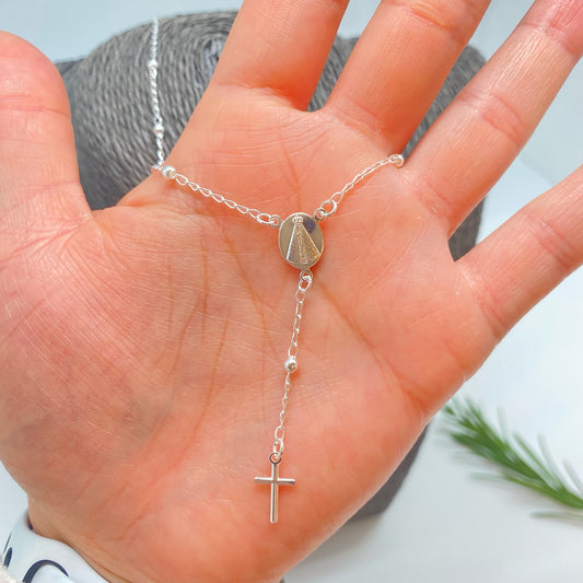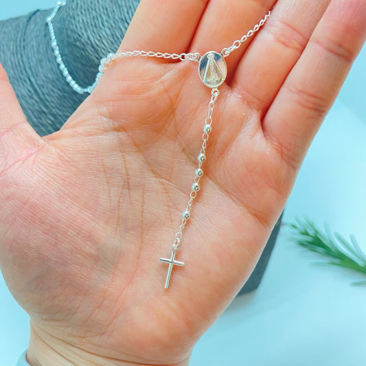 CP229 Collar Rosario Virgen y Cruz Largo 46 cm Largo cadena y Cruz 6 cm Collar Terminado Baño Plata