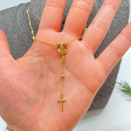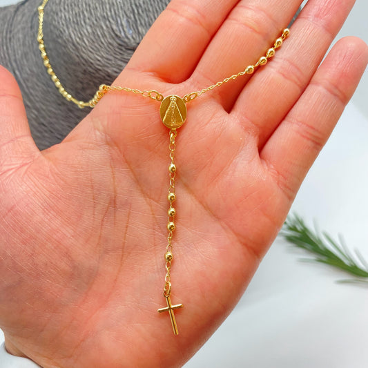 CO229 Collar Rosario Virgen y Cruz Largo 46 cm Largo cadena y Cruz 6 cm Collar Terminado Baño Oro