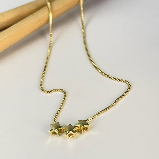 CO194 Collar 3 estrellas pasadas 5.5 mm Espesor 3 mm Cadena Veneciana 1 mm 40 cm más extensor 5.5 cm Collar Terminado Baño Oro