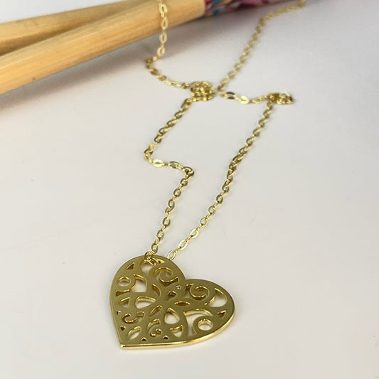 CO201 Collar Corazón Calado 20 x 22 Espesor 0.8 mm Cadena Candado facetada 45 cm más extensor de 5 cm Collar Terminado Baño Oro