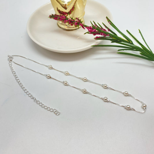 CP200 Collar Chocker Perlas Cadena Veneciana 1 mm Perlas 4 mm Largo 32 cm más extensor 10 cm Collar Terminado Baño Plata