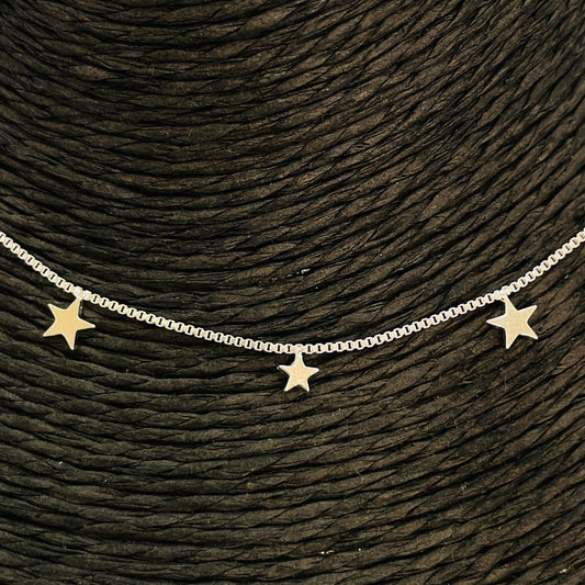CP194 Collar 3 estrellas pasadas 5.5 mm Espesor 3 mm Cadena Veneciana 1 mm 40 cm más extensor 5.5 cm Collar Terminado Baño Plata