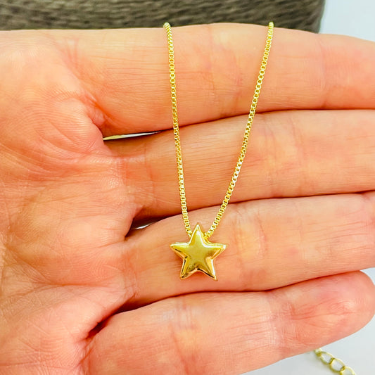 CO184 Collar con Estrella pasada Cadena veneciana 1 mm Estrella doble faz lisa y martelada 10 mm espesor 4 mm Largo 40 cm más extensor 6 cm Collar Terminado Baño Oro