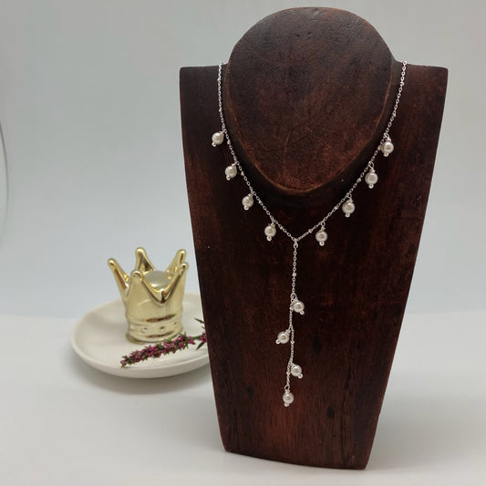 CP181 Collar Cascada con Perlas Cadena candado con bolitas Largo 37 cm mas extensor 8 mm Largo Cascada 7 cm Dia Perlas 5 mm Collar Terminado Baño Plata