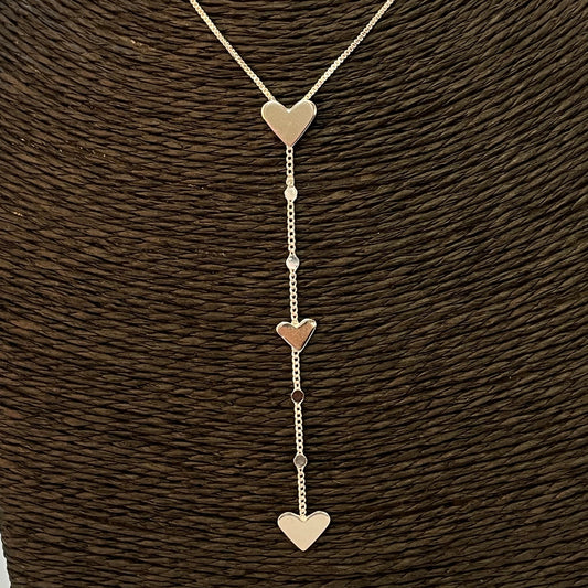 CO169 Collar Cascada Cadena Veneciana con 3 corazones dos de 8 mm y uno de 6 mm Largo 45 cm mas extensor Largo cascada 8 cm Collar Terminado Baño Oro