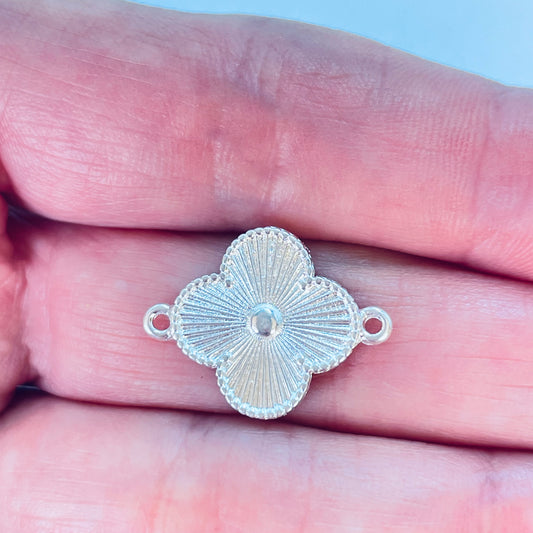 FP1179 Conector Small Trébol 4 hojas Punto Central en relieve líneas estampadas borde rutilado 15 mm más argollitas Espesor 0.8 mm Figura Baño Plata