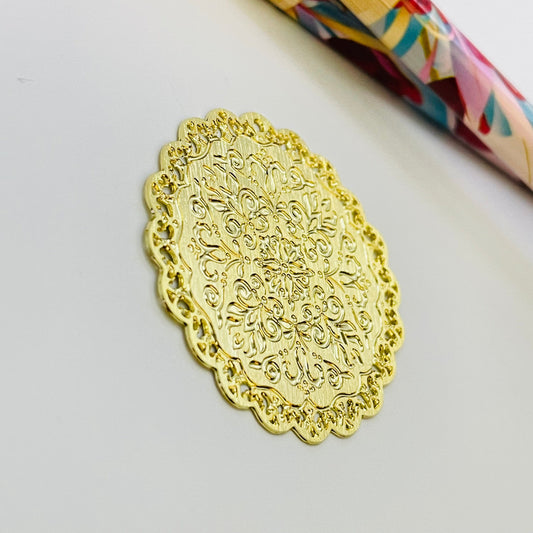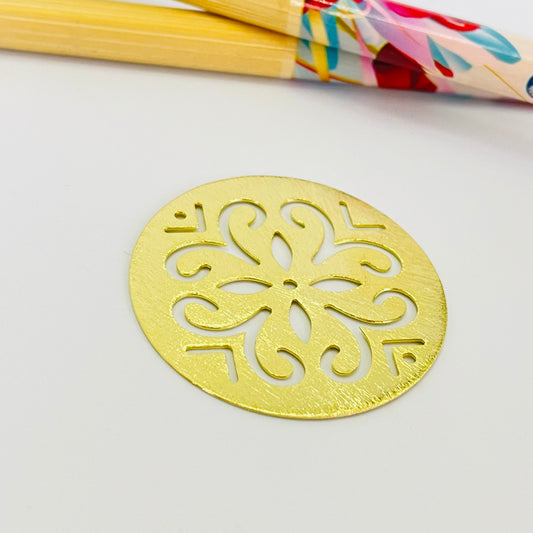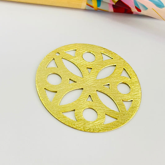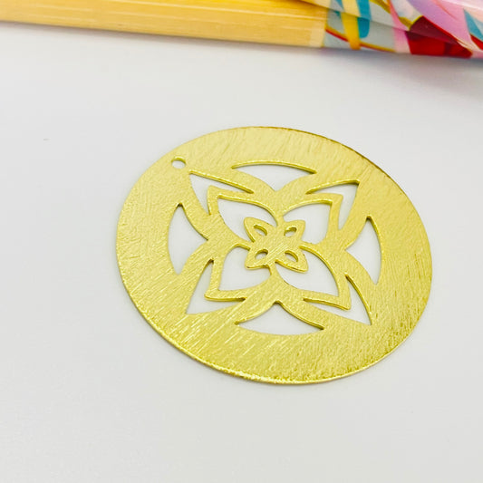 FO1109 Colgante Estampado y Bordes Calados Lijado Perforación Superior diá. 36 mm Espesor 0.8 mm Figura Baño Oro