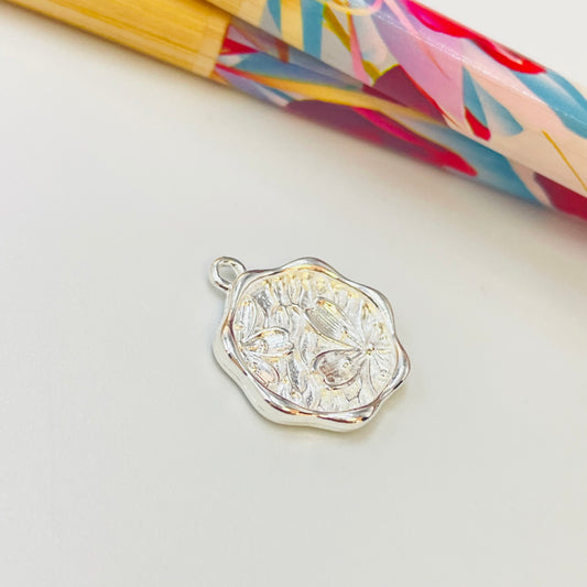 FP1153 Colgante medalla irregular rústico flores en relieve Diá. 14.5 mm más argollita Espesor 2 mm Figura Baño Plata