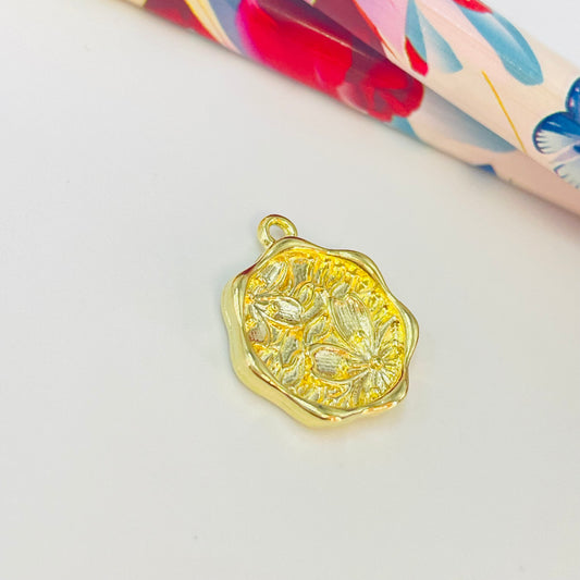 FO1153 Colgante medalla irregular rústico flores en relieve Diá. 14.5 mm más argollita Espesor 2 mm Figura Baño Oro
