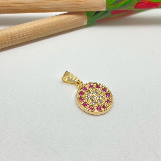FO945 Colgante con Circones Rubí en el borde y 6 circones cristal en el centro diá. 14 mm más argollita más balier Figura Baño Oro
