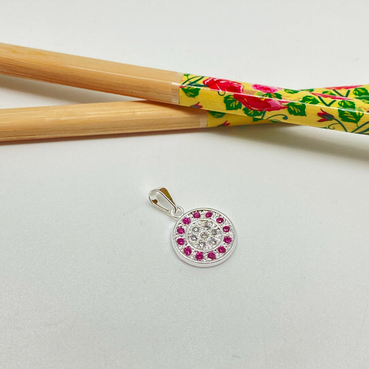 FP945 Colgante con Circones Rubí en el borde y 6 circones cristal en el centro diá. 14 mm más argollita más balier Figura Baño Plata