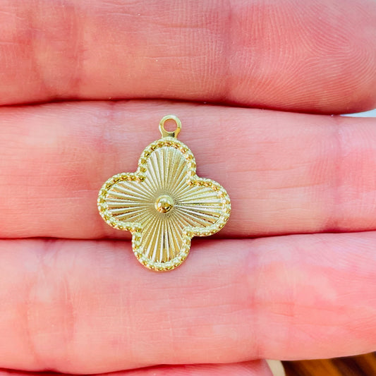 FO1178 Colgante Small Trébol 4 hojas Punto Central en relieve líneas estampadas borde rutilado 15 mm más argollita Espesor 0.8 mm Figura Baño Oro