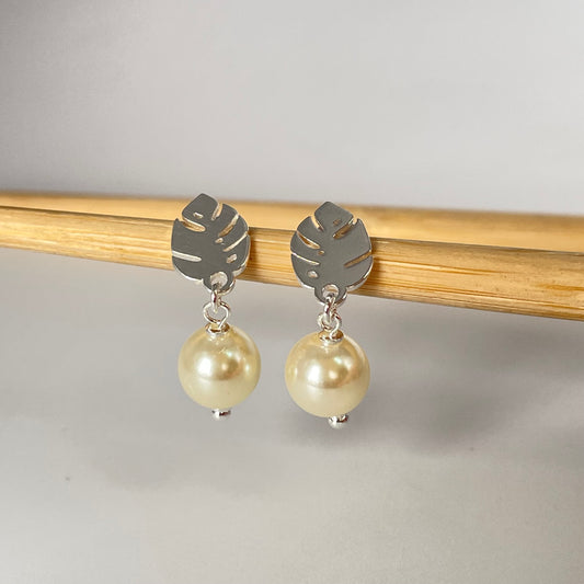 XP438 Aro Mini Monstera Perla Base Hoja Monstera 12x8 mm Perla Diá. 8 mm Largo Total 24 mm Aro Baño Plata