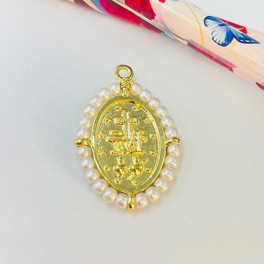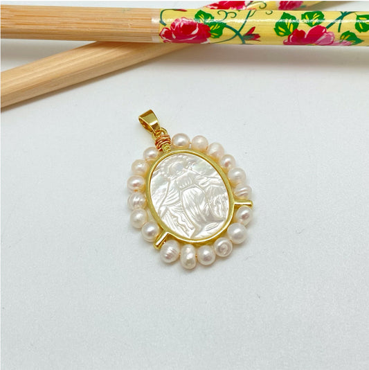 FO995 Colgante Ovalado Virgen de los Rayos o Milagrosa tallada en nácar Borde perlas de río 4 mm 30 x 25 mm más valier Figura Baño Oro