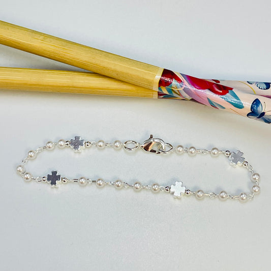 PP20 Pulsera Perlas diá. 3 mm con mini cruces 5 mm espesor 3 mm Largo 16.5 cm Pulsera Baño Plata