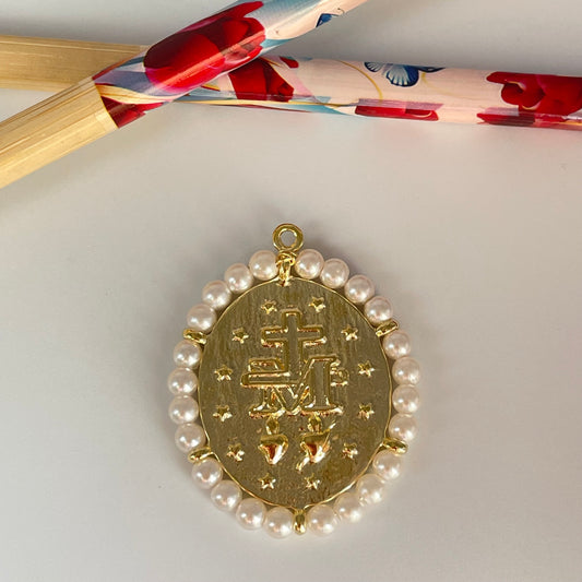 FO1119 Colgante Ovalado Virgen de los Milagros Borde perlas de 4 mm 37 x 32 más argollita Figura Baño Oro