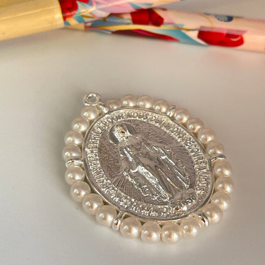 FP1119 Colgante Ovalado Virgen de los Milagros Borde perlas de 4 mm 37 x 32 más argollita Figura Baño Plata