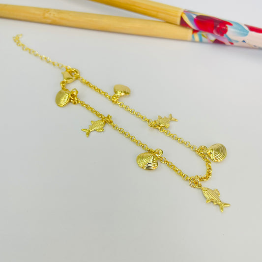 TOBO1001 Tobillera Mar Conchitas y Peces 8 mm Cadena Rolo Eslabón 2 mm Largo 22 cm más Extensor 5 cm Tobillera Baño Oro