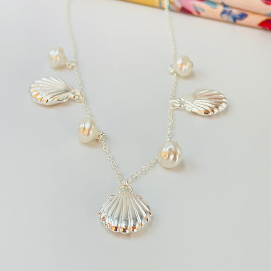 CP239 Collar Conchitas de Mar 14 mm y Perlas 8 mm Cadena Candado Eslabón 1.8 mm Largo 45 cm más Extensor 5 cm Collar Terminado Baño Plata