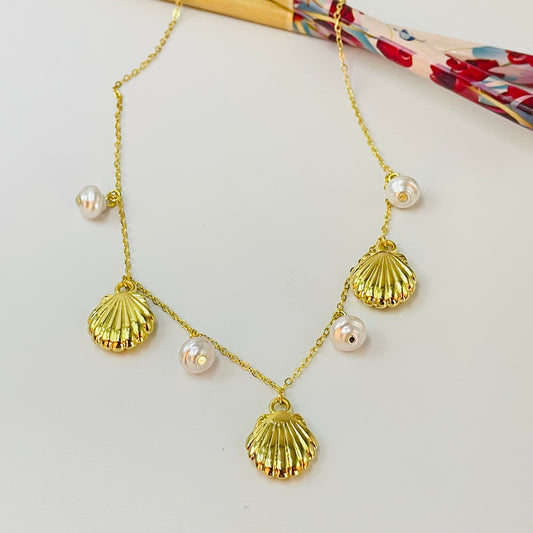 CO239 Collar Conchitas de Mar 14 mm y Perlas 8 mm Cadena Candado Eslabón 1.8 mm Largo 45 cm más Extensor 5 cm Collar Terminado Baño Oro