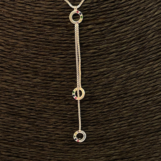 CP168 Collar Cascada con 3 círculos calados con circones de colores de Diá. 6 mm Cadena Veneciana Largo 40 cm largo Cascada 6.3 cm Collar Terminado Baño PlataPrecio habitual $7.400Precio habitualPrecio unitario por-