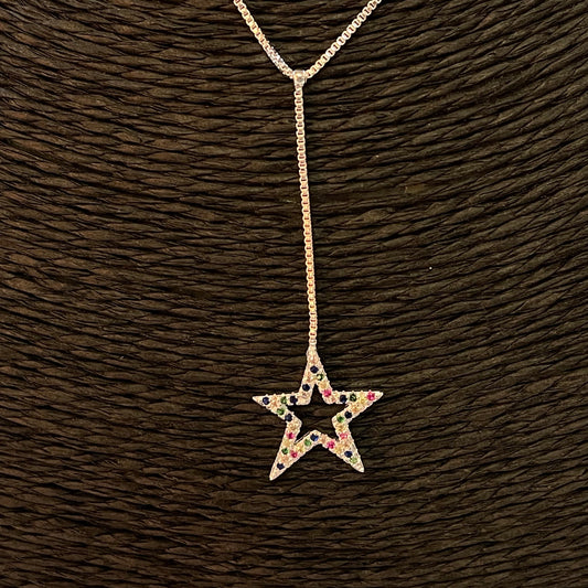CP174 Collar Cascada estrella calada con circones multicolor Cadena Veneciana Largo 40 cm mas extensor Largo cascada 5 cm Estrella 18 mm Collar Terminado Baño PlataPrecio habitual $10.000Precio habitualPrecio unitario por-