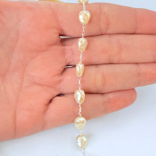 PP24 Pulsera Perla Gota tipo Perla de Río 8 x 6 mm Espesor 4 mm Largo 17.5 cm más extensor de 3 cm con terminal mini corazón Pulsera Baño Plata