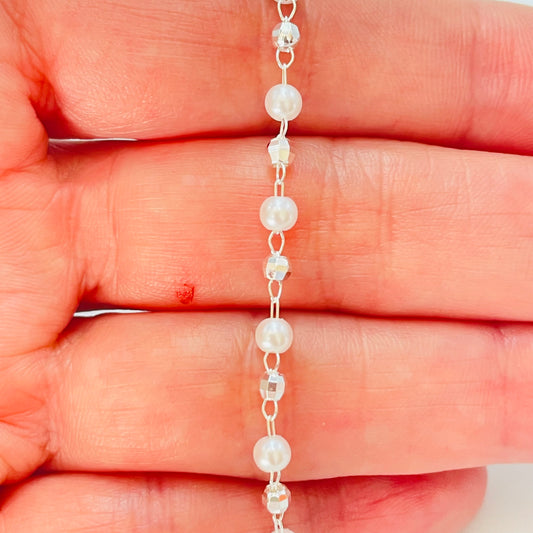 PP26 Pulsera Perlas diá. 4 mm y cadena Largo 17.5 mm más extensor de 3 cm con terminal mini corazón Pulsera Baño Plata