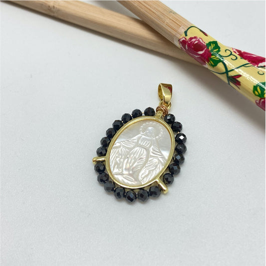 FO1000 Colgante Ovalado Virgen de los Rayos o Milagrosa tallada en nácar Borde piedras Espinela Negra 3 mm 29 x 24 mm más valier Figura Baño Oro