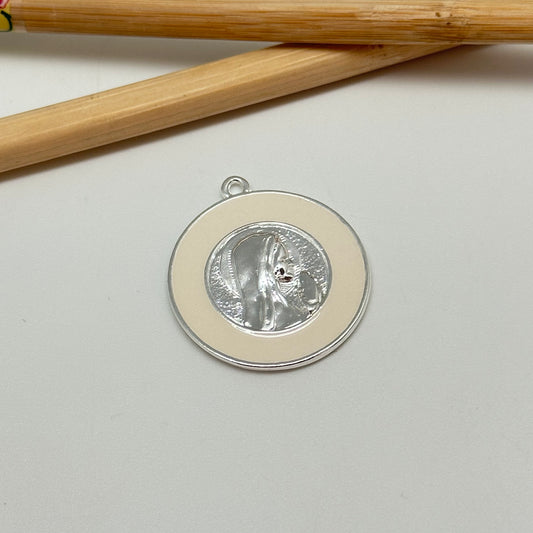 FP1040 Colgante Medalla Virgen Niña con Resina Color Hueso en borde dia. 27 mm mas argollita Figura Baño Plata