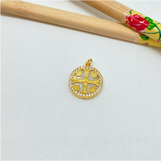 FO992 Colgante Medalla Nácar borde con micro circones y Cruz de San Benito diá. 16 mm más argollita y contra argolla espesor 2 mm Figura Baño Oro