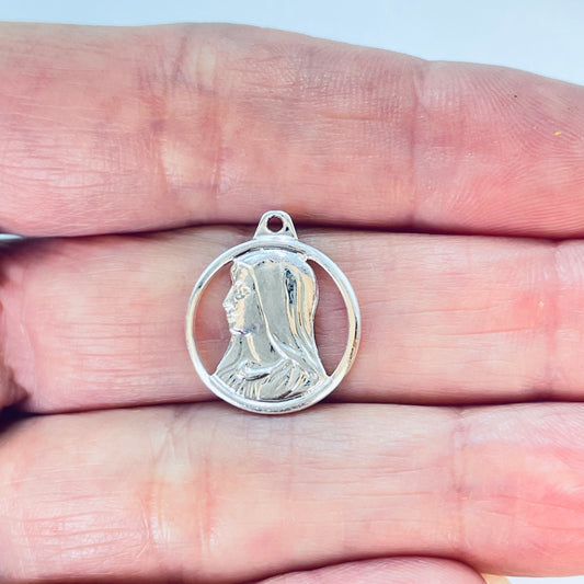 FP1207 Colgante Medalla calada Virgen Niña Diá. 15 mm mas argollita Espesor 1 mm Figura Baño Plata