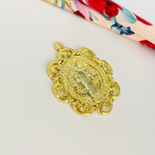 FO1075 Colgante San Benito Borde calado en figuras diá. 32 mm más argollita espesor 1.2 mm Figura Baño Oro