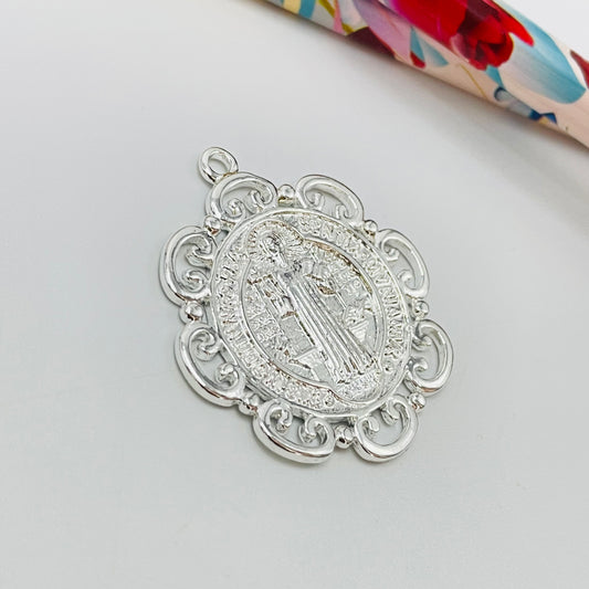 FP1075 Colgante San Benito Borde calado en figuras diá. 32 mm más argollita espesor 1.2 mm Figura Baño Plata