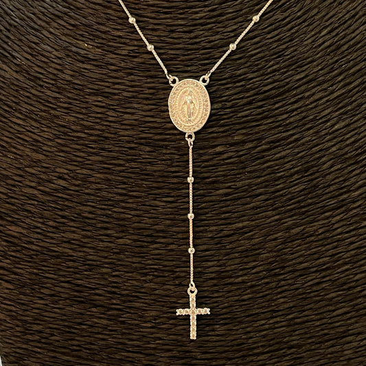CP179 Rosario Virgen de los milagros Borde con mini circones 14x1 mm Cadena veneciana bolitas de 2 mm 40 cm mas extensor de 5 mm Collar Terminado Baño Plata