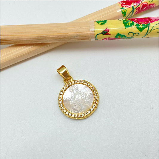 FO1002 Colgante Virgen de Los Rayos o Medalla Milagrosa Tallada en Nácar Borde con micro circones diá. 15.5 mm más valier Figura Baño Oro