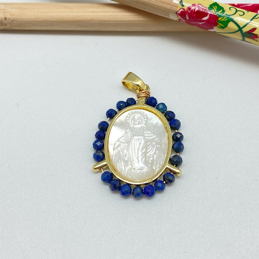 FO999 Colgante Ovalado Virgen de los Rayos o Milagrosa tallada en nácar Borde piedras Lapis lazuli 3 mm 29 x 24 mm más valier Figura Baño Oro