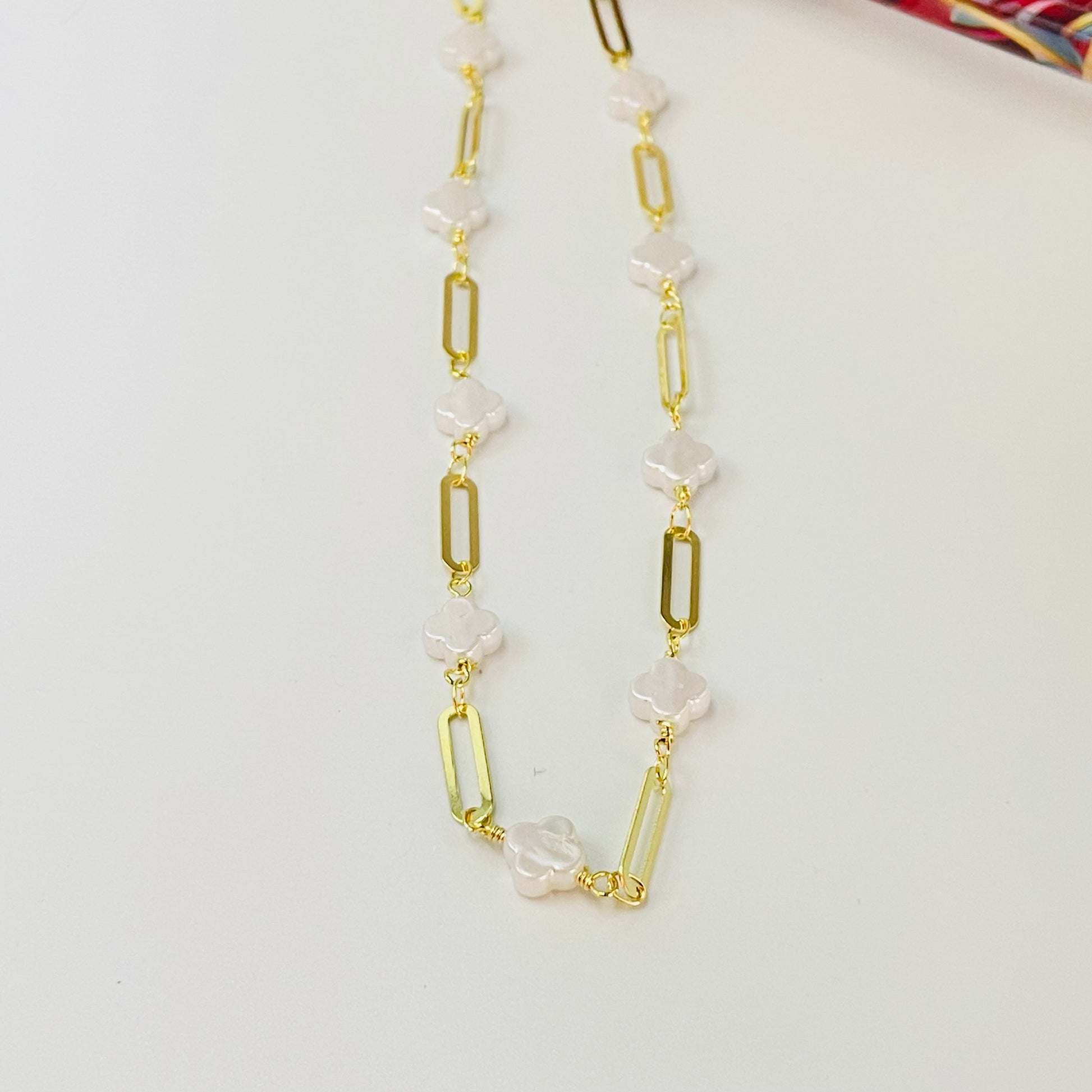 CO238 Collar Tréboles tipo nácar 8 x 8 mm Esp. 3.5 mm y Eslabones Intercalados 13 x 4 mm Largo 40 cm Collar Terminado Baño Oro