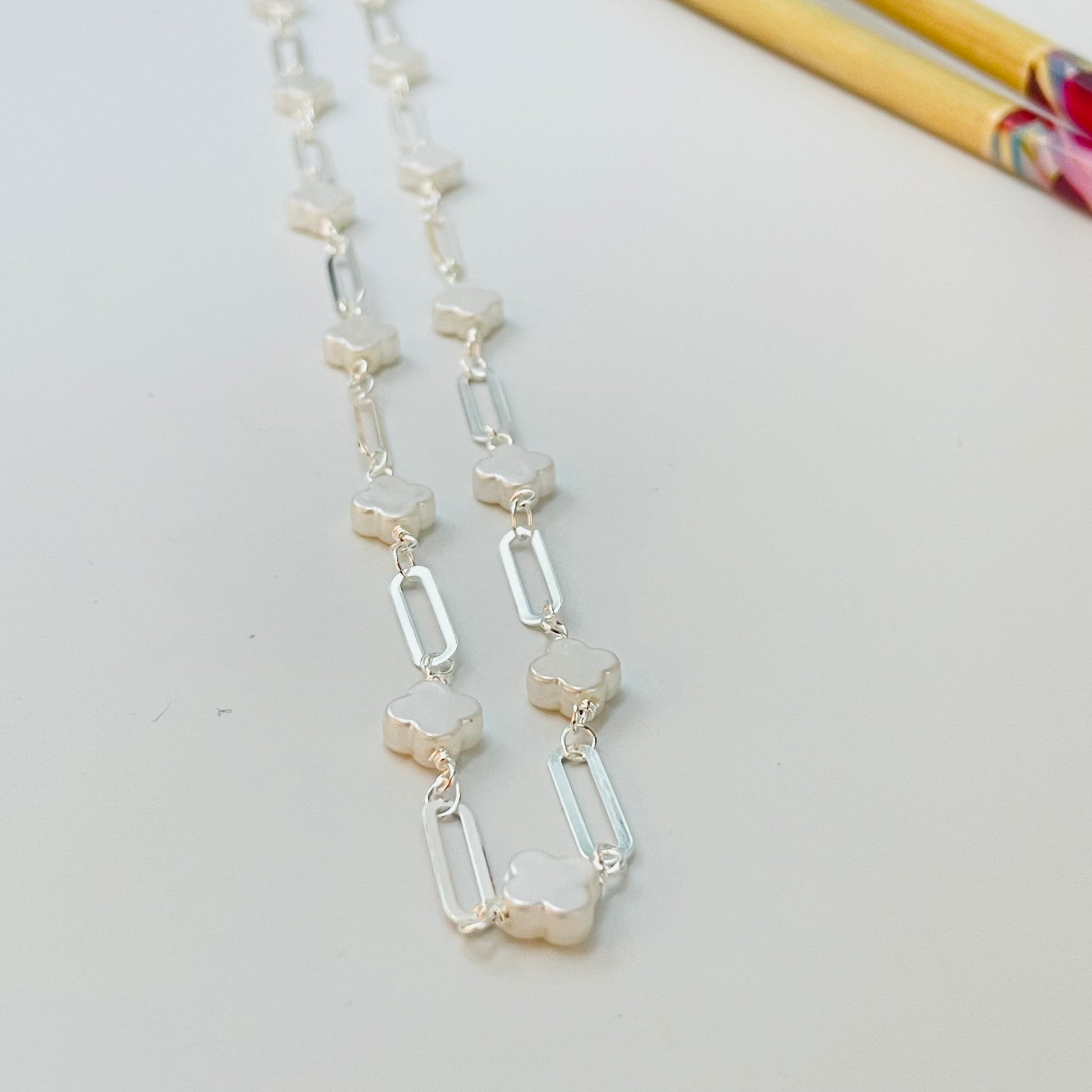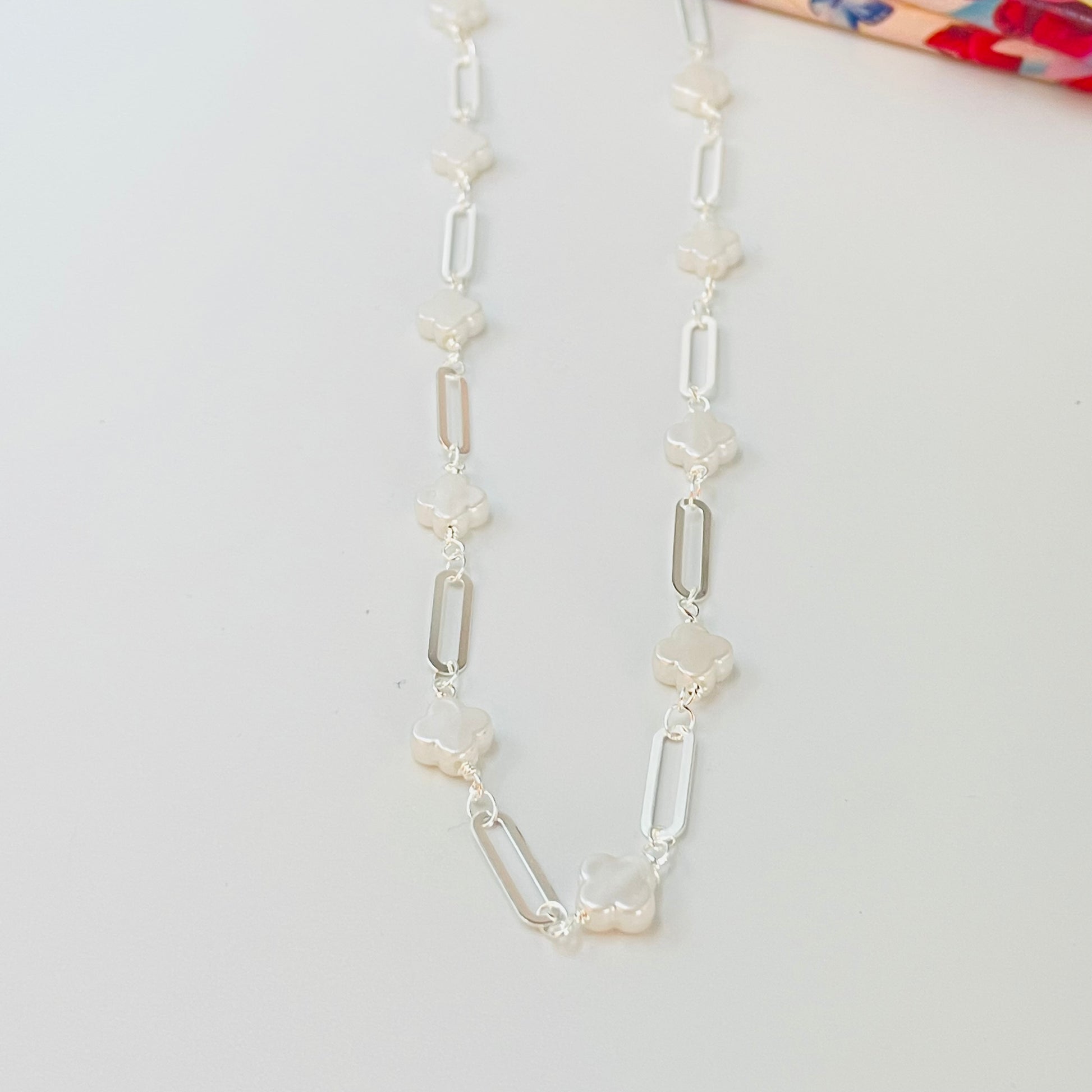 CP238 Collar Tréboles tipo nácar 8 x 8 mm Esp. 3.5 mm y Eslabones Intercalados 13 x 4 mm Largo 40 cm Collar Terminado Baño Plata