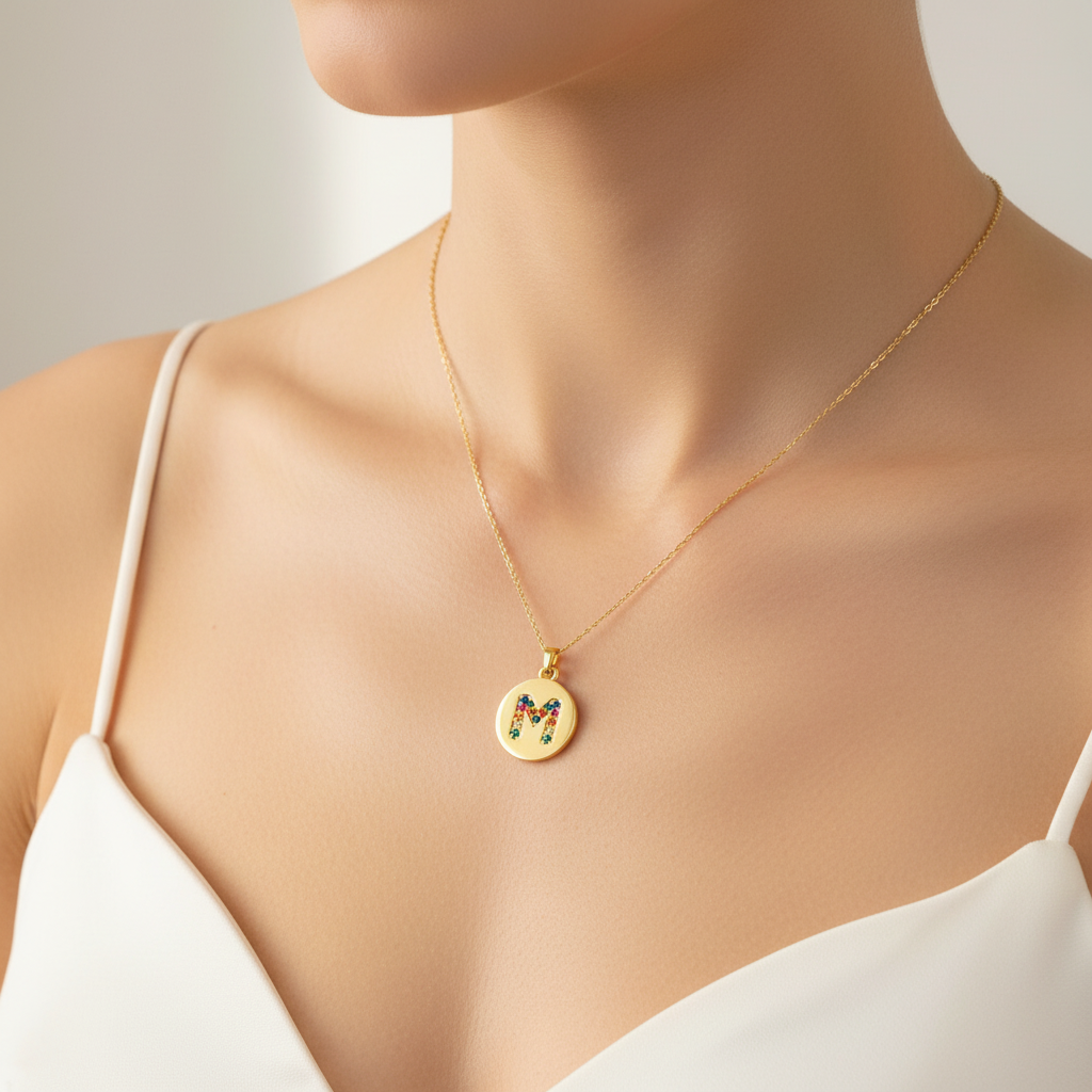 FO912 Colgante Redondo Letra en Circones Multicolor 11 mm más argollita Figura Baño Oro