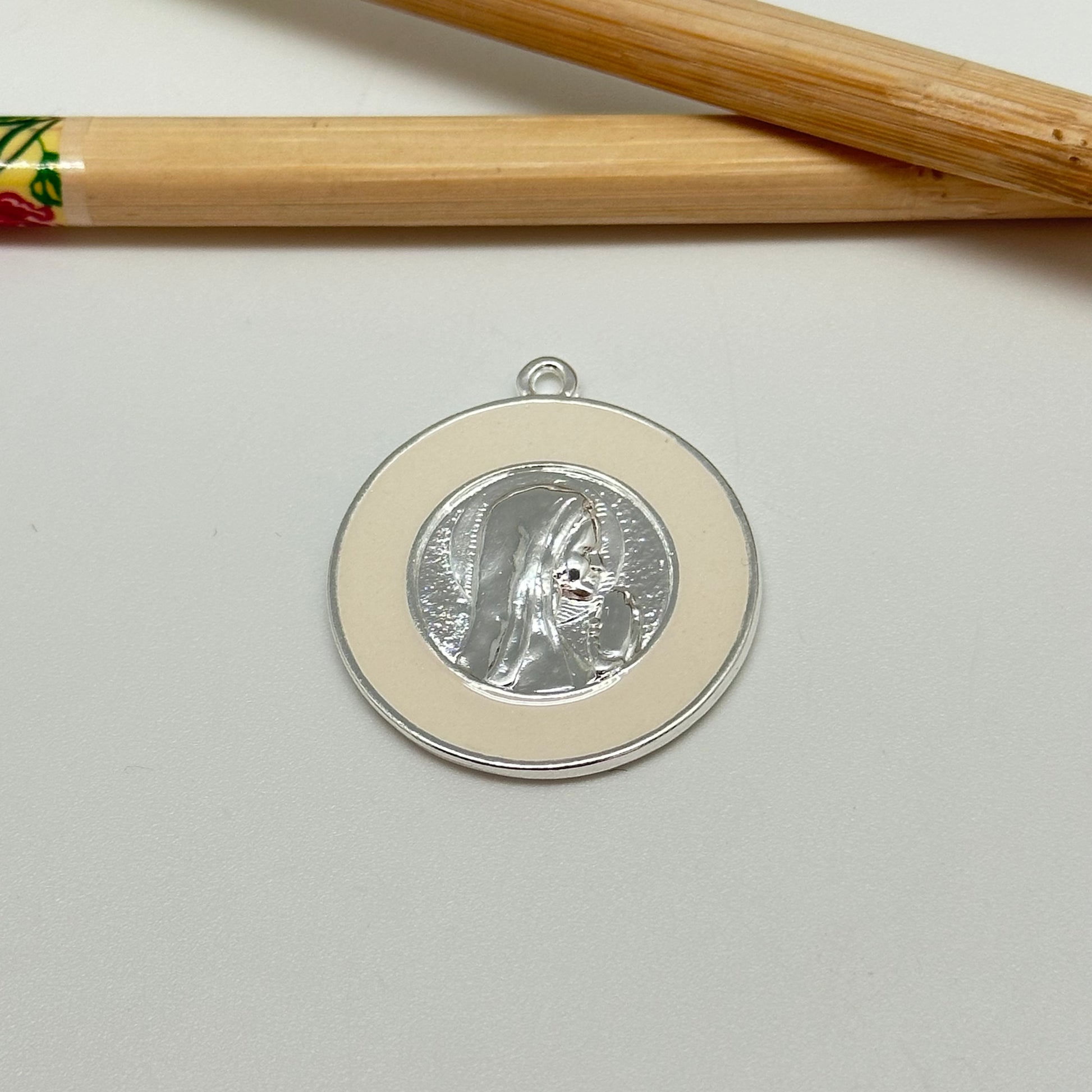 FP1040 Colgante Medalla Virgen Niña con Resina Color Hueso en borde dia. 27 mm mas argollita Figura Baño Plata