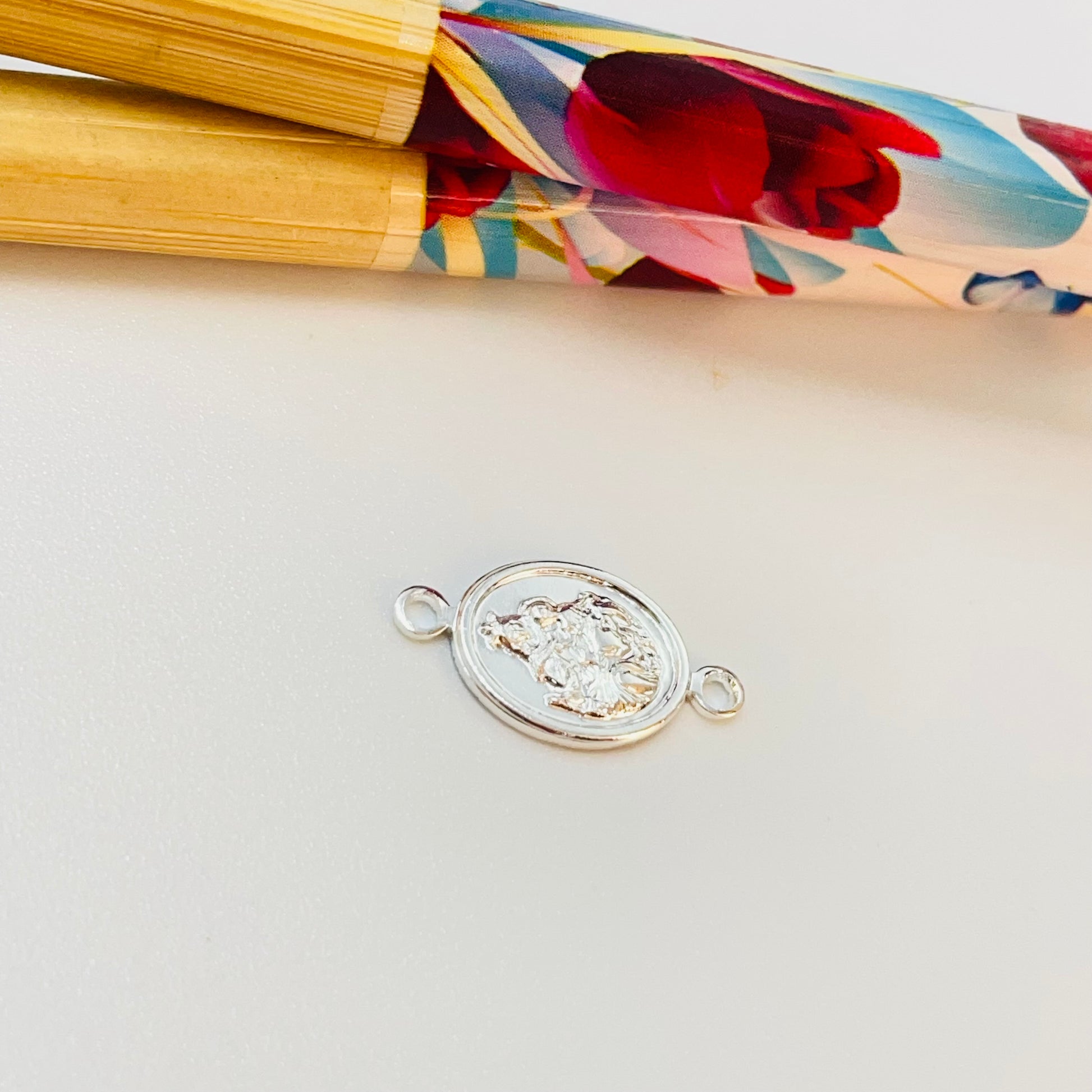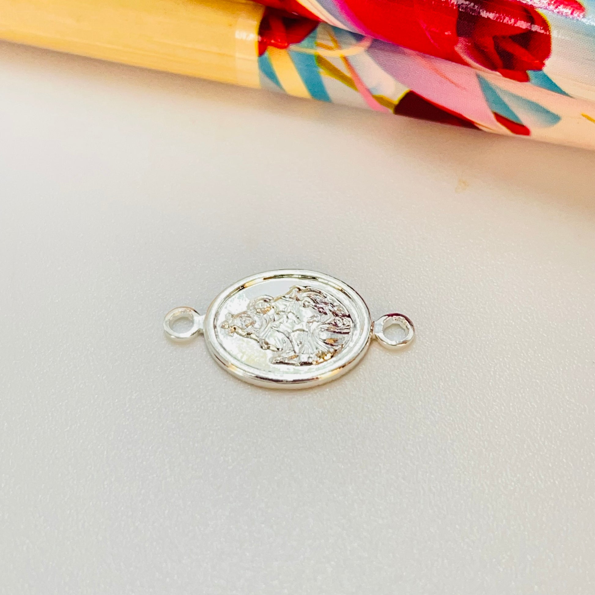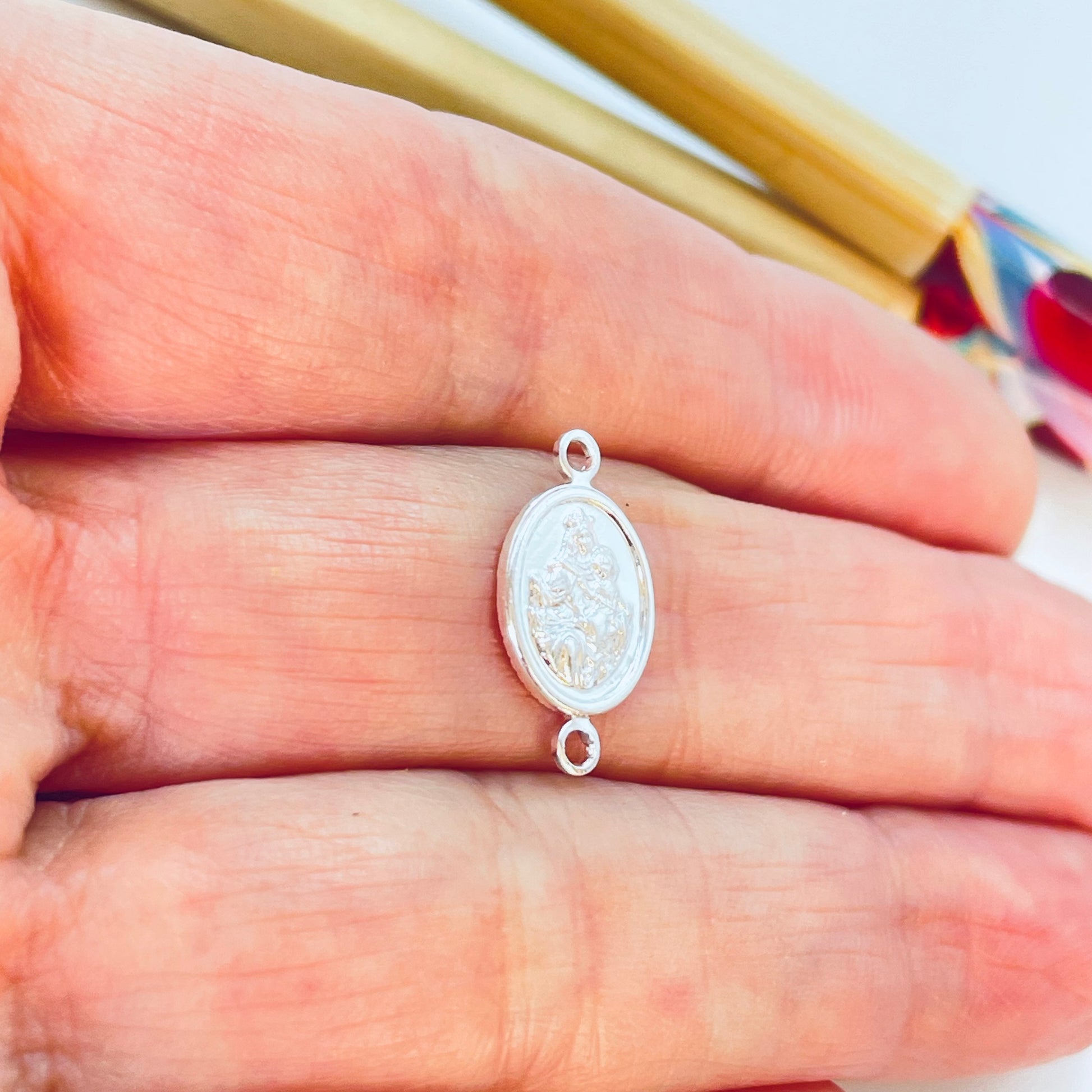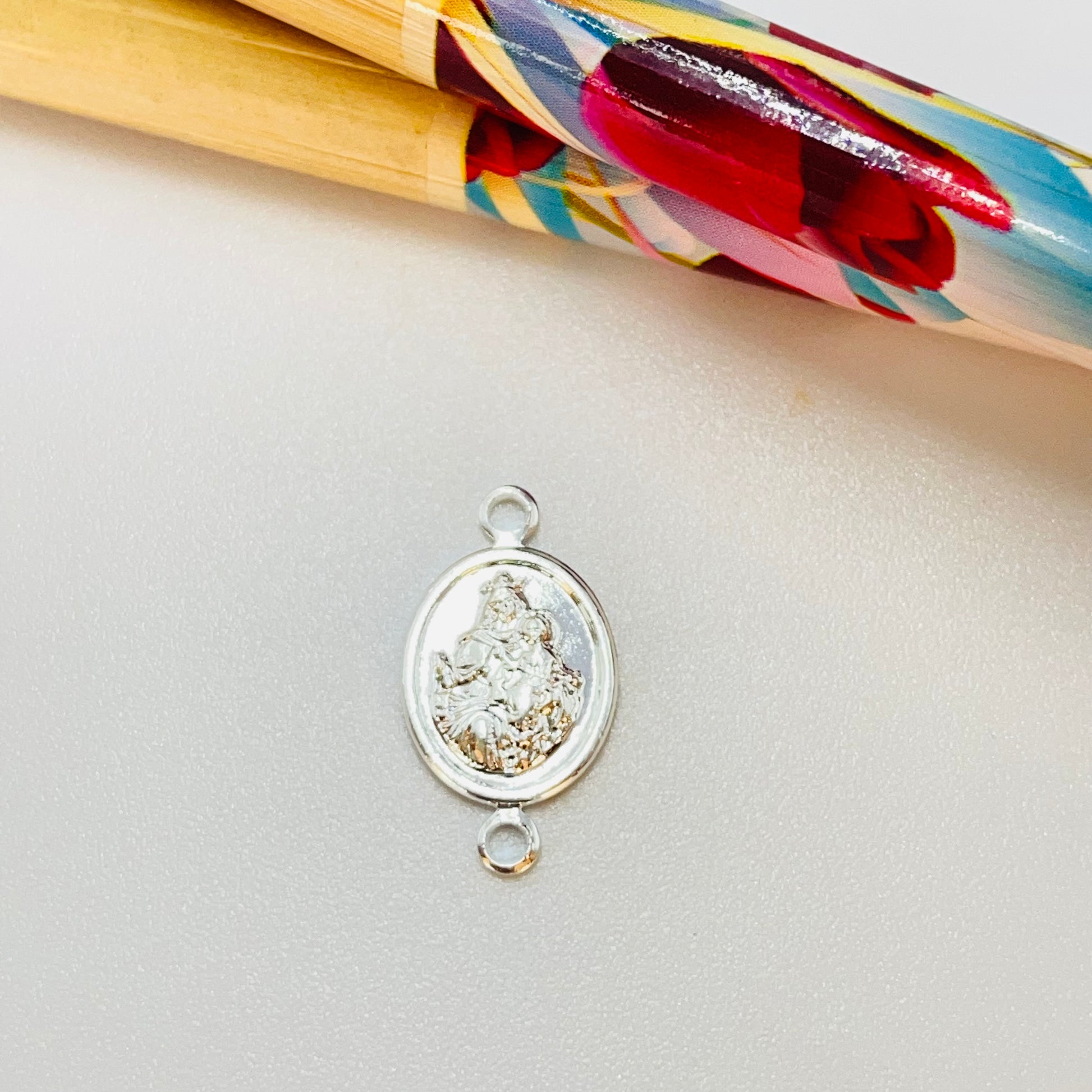 FP1202 Conector Ovalado Nuestra Señora del Carmen 11 x 9 mm más argollitas Espesor 1.1 mm Figura Baño Plata