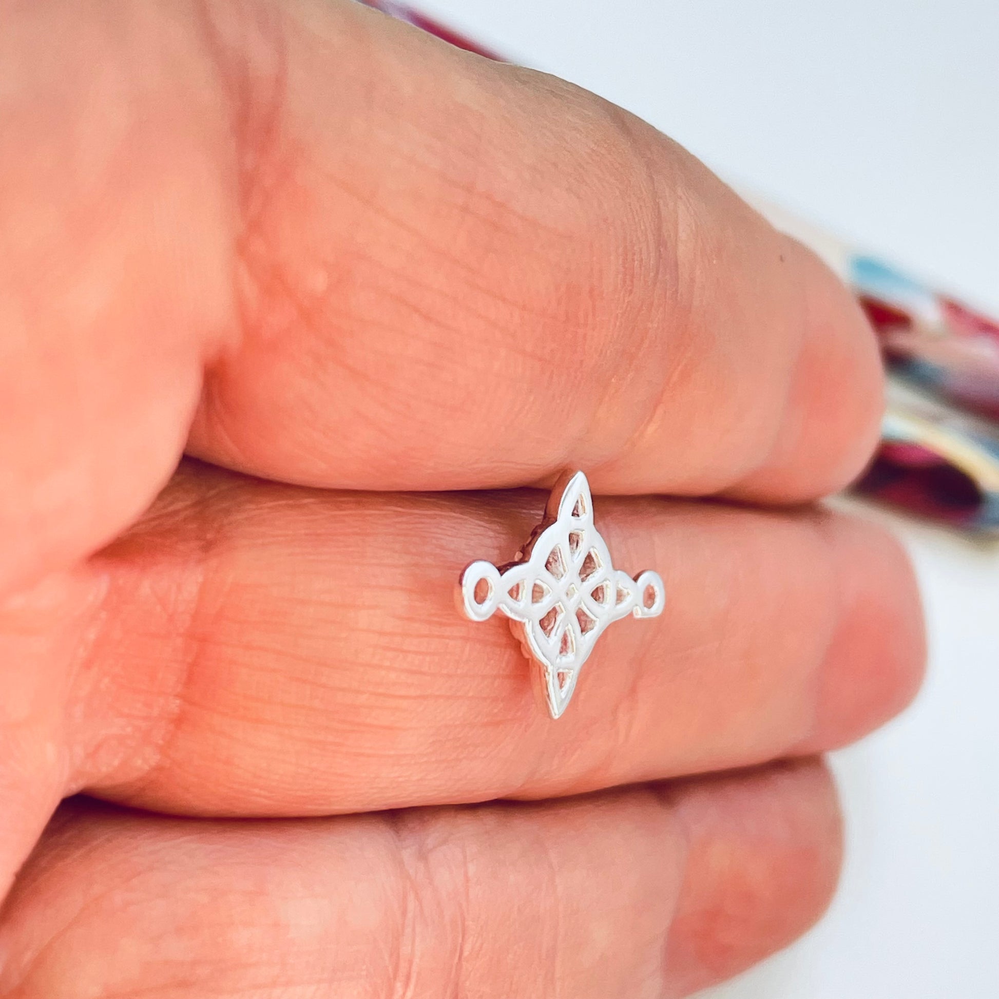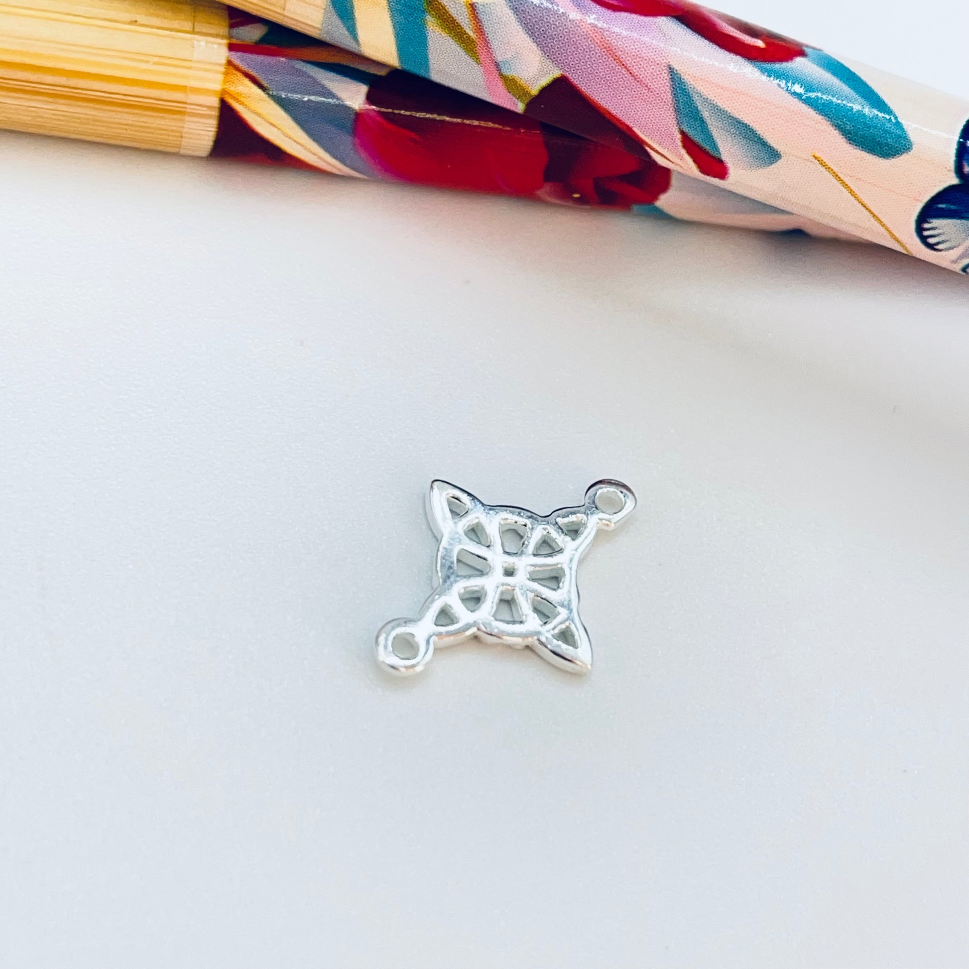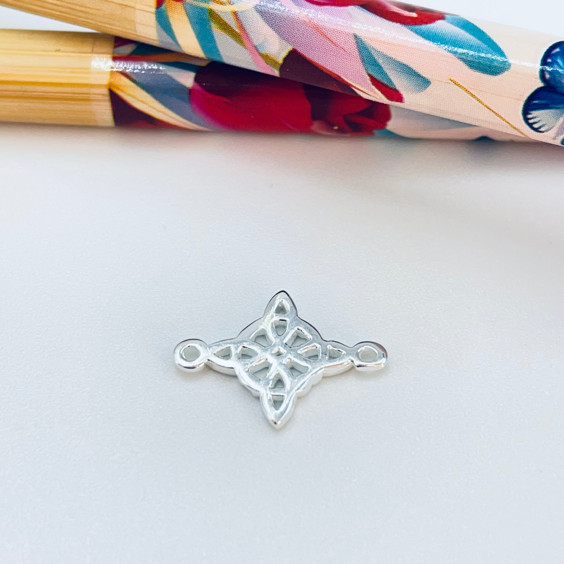 FP1221 Conector Nudo de Bruja 12 x 12 mm más argollitas Espesor 1.1 mm Figura Baño Plata